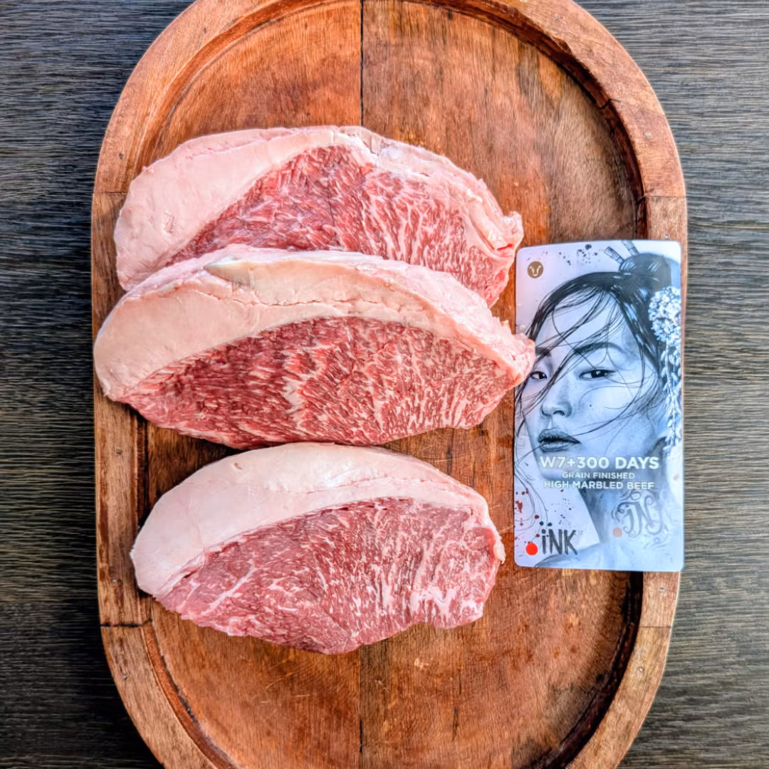 Denna picanha kommer från en unik korsning av Wagyu och Black Angus (50/50), uppfödda på familjeägda gårdar i Uruguay. Djuren lever fritt på gröna stäpper och utfodras med spannmål under de sista 300 dagarna (Grain Fed 300D) – vilket ger en köttbit med djup smak, hög marmorering och fantastisk saftighet.